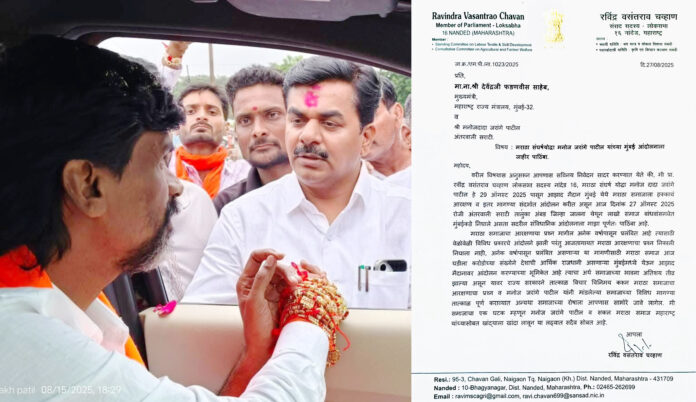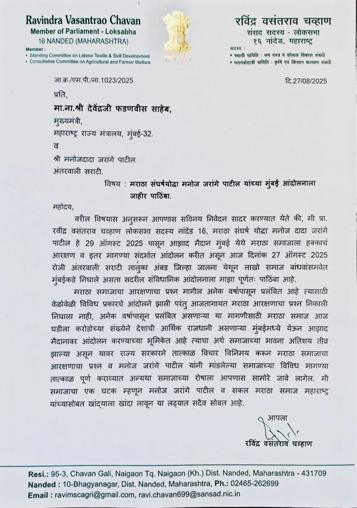 नांदेड:- मराठा आरक्षणाच्या मागणीसाठी मनोज जरांगे पाटील यांच्या नेतृत्वाखाली सुरू असलेल्या मुंबई मोर्चाला नांदेडचे खासदार रविंद्र वसंतराव चव्हाण यांनी जाहीर पाठिंबा दिला आहे. त्यांनी या संदर्भात मुख्यमंत्री देवेंद्र फडणवीस आणि मनोज जरांगे पाटील यांना पत्र लिहिले आहे.