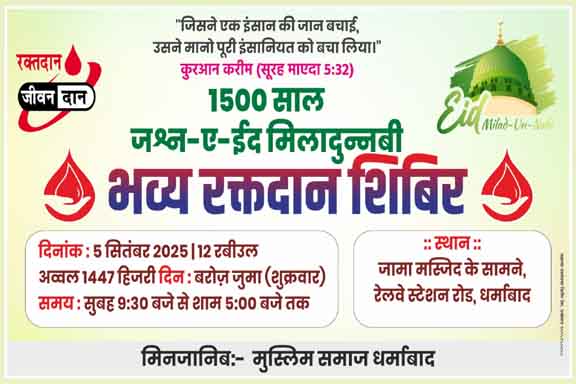 धर्माबाद:-  ईद ए मिलादुन्नबीच्या पवित्र प्रसंगी धर्माबाद शहरात समस्त मुस्लिम समाजातर्फे एका भव्य रक्तदान शिबिराचे आयोजन करण्यात आले आहे. पैगंबर मुहम्मद सल्लल्लाहु अलैहि वसल्लम यांच्या १५०० व्या जयंतीचे औचित्य साधून, शुक्रवारी, ५ सप्टेंबर २०२५ रोजी शुक्रवार सकाळी ९ ते सायंकाळी ५ वाजेपर्यंत हे शिबिर होणार आहे.