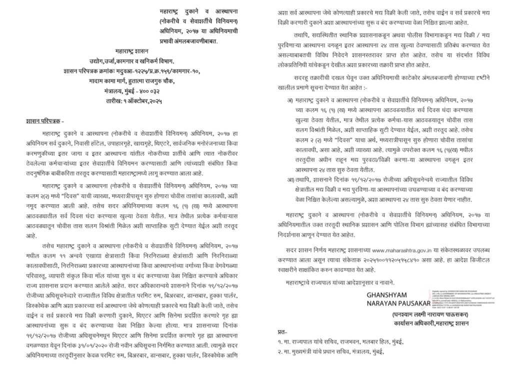मुंबई :- राज्यातील महायुती सरकारने मोठा निर्णय घेतला आहे. यानुसार आता राज्यभरातील दुकाने २४ तास खुली ठेवण्यास परवानगी असणार आहे. राज्यातील दुकाने, हॉटेल्स आणि इतर आस्थापना २४ तास उघडी ठेवता येणार असल्याने, ही सर्वसामान्यांच्या दृष्टीने आनंदाची बातमी आहे.तर मद्यपान गृहे, बार परमिट रूम, हुक्का पार्लर, देशी बार हे २४ तास सुरू राहणार नाहीत. केवळ इतर सर्व आस्थापना ,खाद्यगृहं, आणि दुकाने आता 24 तास सुरू राहतील. हे देखील स्पष्ट करण्यात आले आहे.