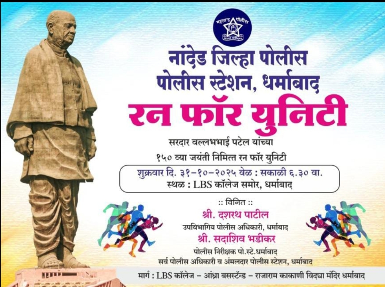 धर्माबाद :- सरदार वल्लभभाई पटेल यांच्या १५० व्या जयंतीचे औचित्य साधून राष्ट्रीय एकात्मतेचा आणि अखंडतेचा संदेश जनमानसात पोहोचविण्यासाठी नांदेड जिल्हा पोलीस यांच्या मार्गदर्शनाखाली पोलीस स्टेशन, धर्माबाद यांच्या वतीने ‘रन फॉर युनिटी’ (Run for Unity) या भव्य दौडचे आयोजन केले आहे. शुक्रवार, दि. ३१ ऑक्टोबर २०२५ रोजी सकाळी ही दौड होणार असून, यासाठी धर्माबाद शहरात उत्साहाचे वातावरण निर्माण झाले आहे.